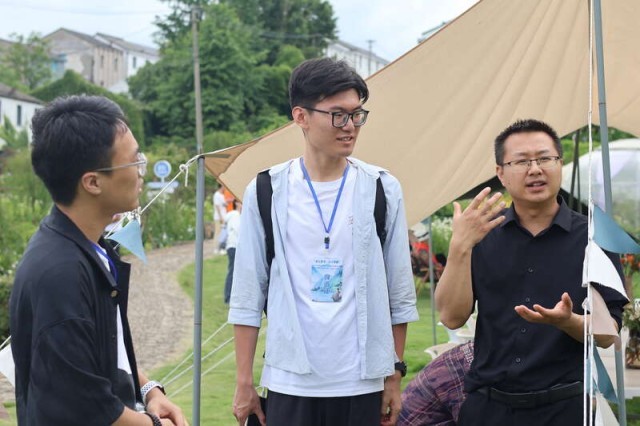 工作人员为大学生介绍南溪村建设情况。吴霞/摄
