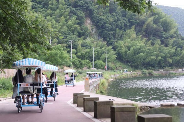 大学生沿步道骑行游览山野风光。吴霞/摄