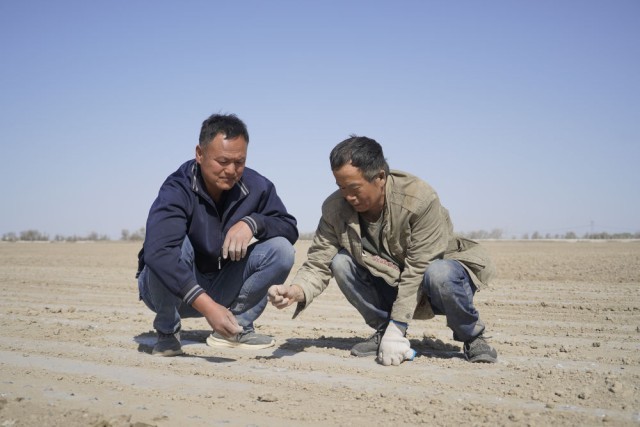 2024年4月23日,双泉农业专业合作社负责人何洪涛(左)在棉田里工作。