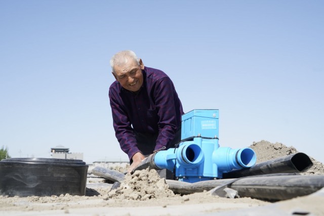 “我手下有七八个人,都是这里的村民,管着1500亩地。”哈衣绕拉得意地说。棉花播种前后,他和同伴忙着安装连接泵房和滴灌带的一整套供水系统,由于每一个水闸都安有传感器,哈衣绕拉用一台手机就能监测灌溉水流量、控制阀门开关。