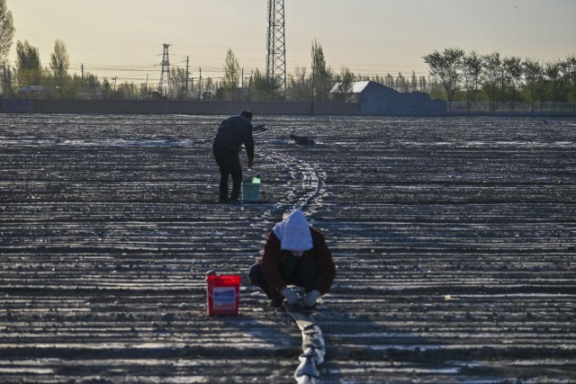 2024年4月19日,在新疆沙湾市,农民在棉田里安装连接泵房和滴灌带的供水系统。