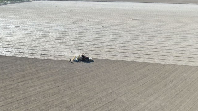 2024年4月23日,在新疆沙湾市,播种机在棉田里播种棉花(无人机照片)。