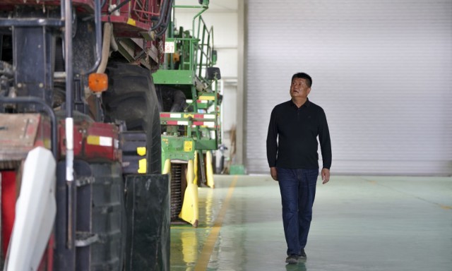 2024年4月18日,在新疆沙湾市,韩波在农机专业合作社车间查看农机。