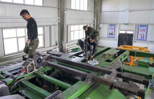2024年4月18日,在新疆沙湾市,工作人员在韩波的农机专业合作社改装农机。