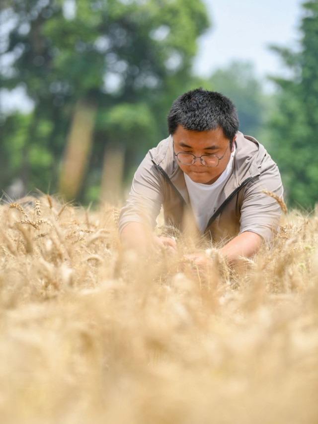 在四川成都崇州市三江街道古泉村,舒星宇在麦田里查看小麦成熟情况(5月15日摄)。