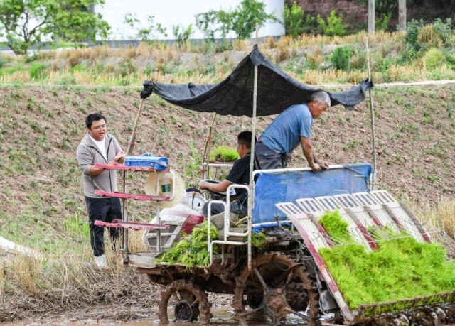 在四川成都东部新区董家埂镇小河村,舒星宇(左)在和插秧机手沟通机插秧的注意事项(5月15日摄)。