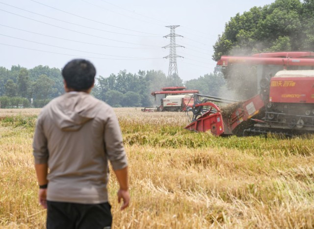 在四川成都崇州市三江街道古泉村,舒星宇在麦田边观看小麦收割机作业(5月15日摄)。