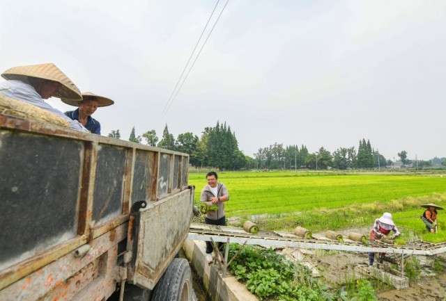 在四川成都崇州市大划街道石桥村,舒星宇(左三)在帮忙运送秧盘(5月15日摄)。