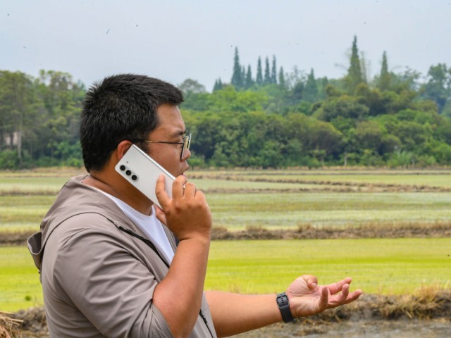 在四川成都崇州市大划街道石桥村,舒星宇接到种植大户的电话,沟通农机服务需求(5月15日摄)。