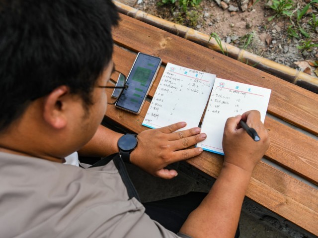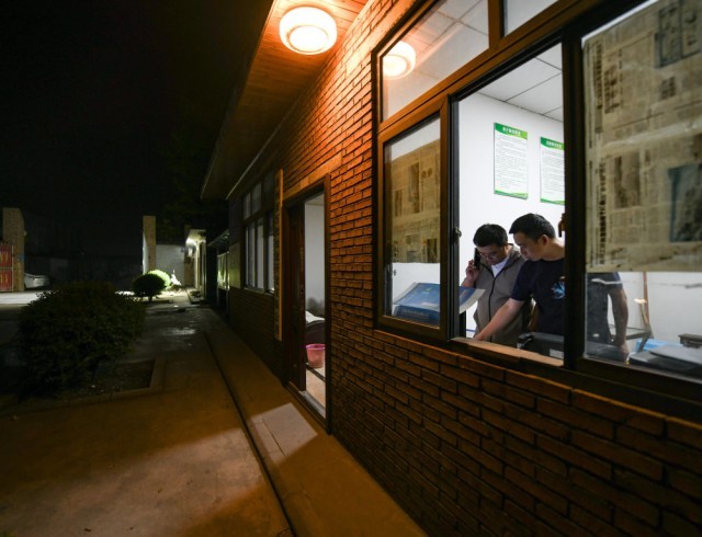 在四川省成都东部新区董家埂镇小河村,舒星宇在安排第二天的机插秧计划(5月15日摄)。
