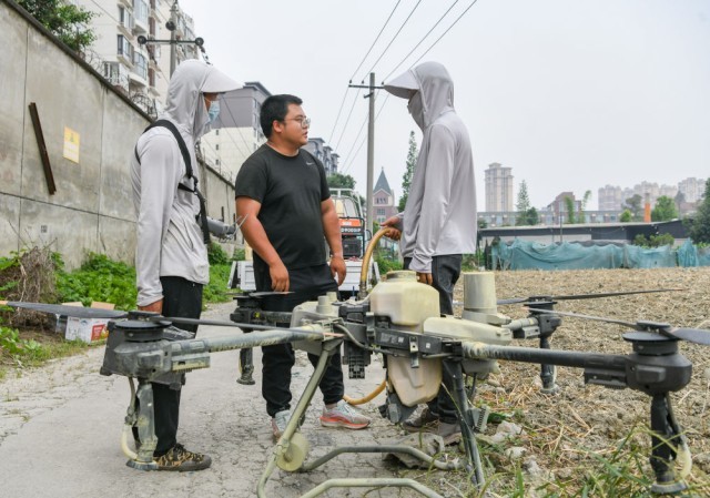 在四川成都温江区万春镇,舒星宇(中)和植保无人机飞手在沟通当天打药的区域和作业时间(5月16日摄)。