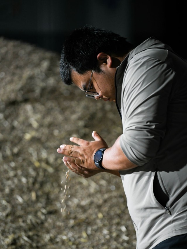 在四川成都崇州市万茂欣欣农机专业合作社,舒星宇在查看库房待烘干小麦的情况(5月15日摄)。