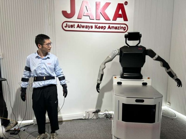 一名年轻的工程师正在“训练”拟人态双臂机器人,身上穿戴着可采集数据的手套和臂环,随着工程师手部动作变化,面前的双臂机器人也在做着相同的动作。据介绍,该款机器人未来将落地应用于工业领域,能代替人在各种特殊环境中完成操作。
