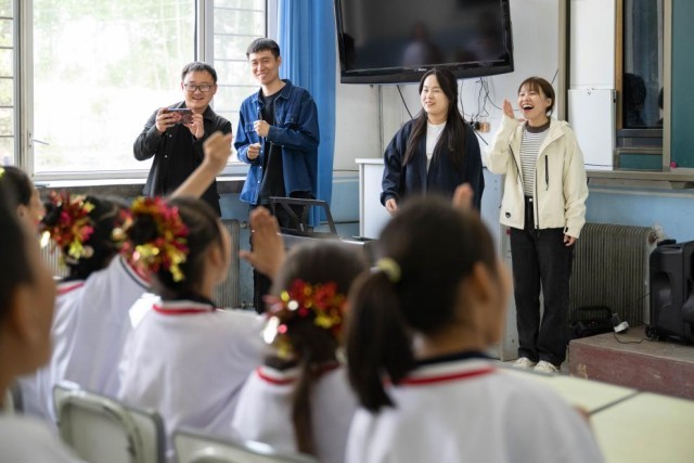 5月29日,在安达市中本镇中心小学,李平(左二)、张雨(左一)和“村里的孩儿”音乐班的新成员一起唱歌、交流。