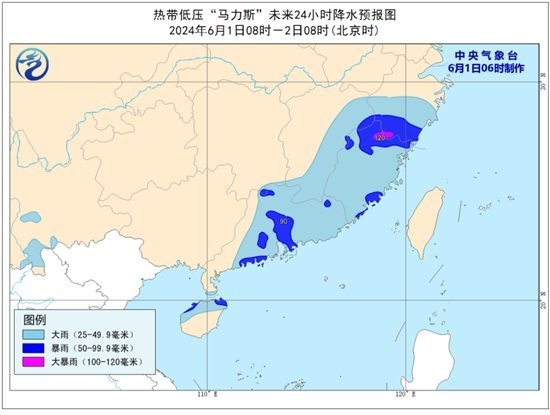 降水预报:6月1日08时至2日08时,广东大部、海南岛北部和西部、福建、江西南部和东部、浙江南部等地有大到暴雨,其中,浙江南部、福建西北部等地部分地区有大暴雨(100~120毫米)。
