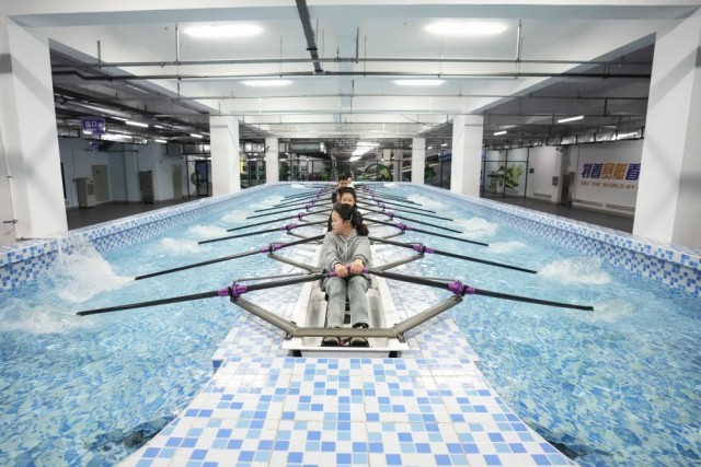 1月24日,学生在辽宁省沈阳市浑南区第九小学进行赛艇训练。新华社记者 潘昱龙 摄