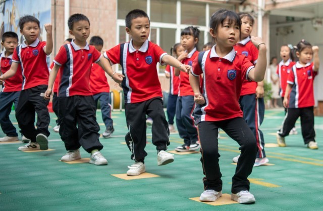 5月29日,在湖北省武汉市江汉区童梦幼儿园,孩子们在练习洪门青龙拳练步操。