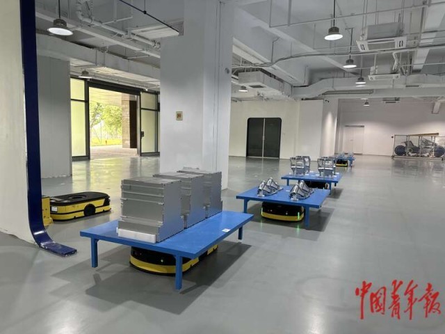 6月1日,在浩万公司5G智能积木工厂,AGV小车抓取、运输零部件。中青报·中青网记者 石佳/摄