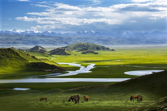 位于天山南麓的巴音布鲁克既是中国仅次于内蒙古鄂尔多斯的第二大草原,又是中国最大的高山草原,巴音布鲁克草原共有大小13处泉水,7个湖泊,以及20条河流。蜿蜒在草原上的开都河素有“九曲十八弯”的美称。
