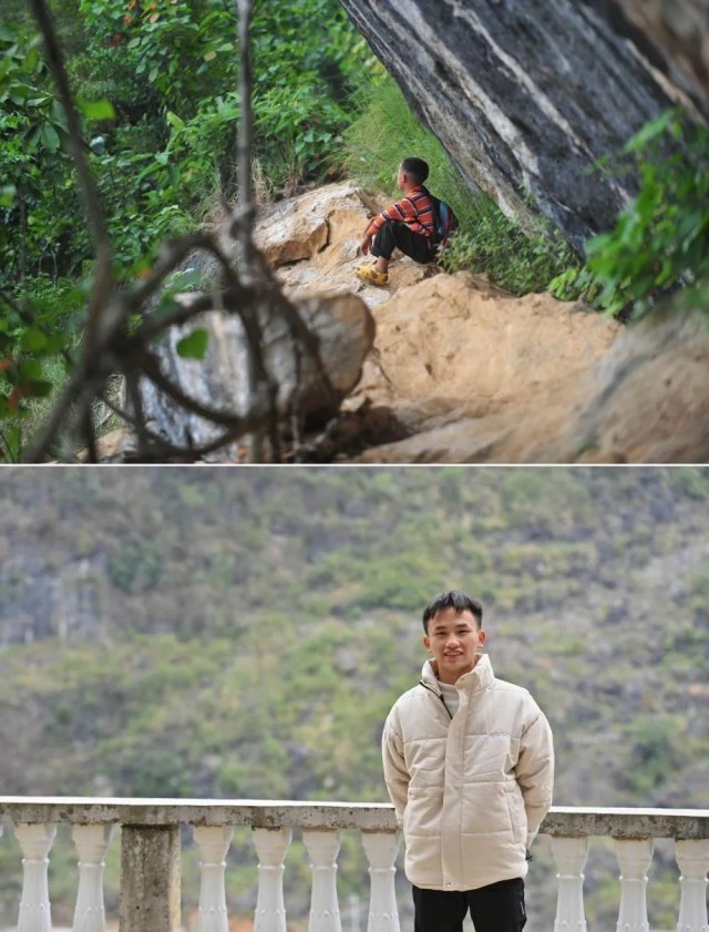 拼版照片:下图为2023年1月16日,在河池市大化瑶族自治县板升乡弄雷村,即将从技校毕业的蒙科佑站在家门口;上图为2012年9月5日,在大化瑶族自治县板升乡弄雷村,10岁的蒙科佑在上学途中,坐在悬崖边上休息。22岁的蒙科佑,希望能挣钱供弟弟妹妹读书,让他们接受更好的教育。