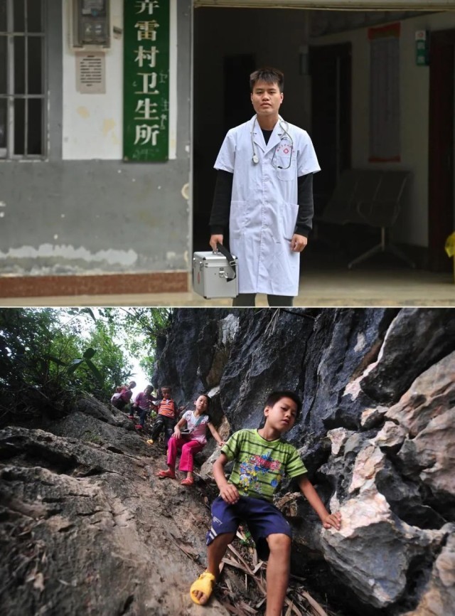 拼版照片:上图为2023年5月24日,村医蒙富松站在大化瑶族自治县板升乡弄雷村卫生所前(新华社记者 胡星宇 摄);下图为2012年9月5日,10岁的蒙富松(右一)爬悬崖去学校读书(新华社记者 黄孝邦 摄)。2021年,蒙富松从卫校毕业,回到家乡成为一名村医。