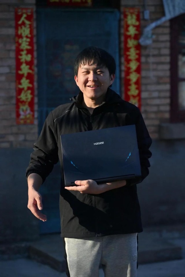 在柳州市鹧鸪江路附近一处出租屋外,熊三耶在展示刚刚购买的笔记本电脑(2024年2月11日摄)。