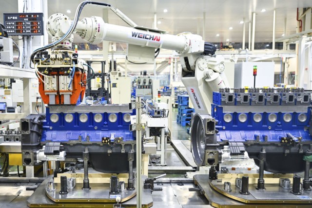 2023年11月30日,在潍柴动力股份有限公司总装生产线,机器人在装配清洁能源发动机。