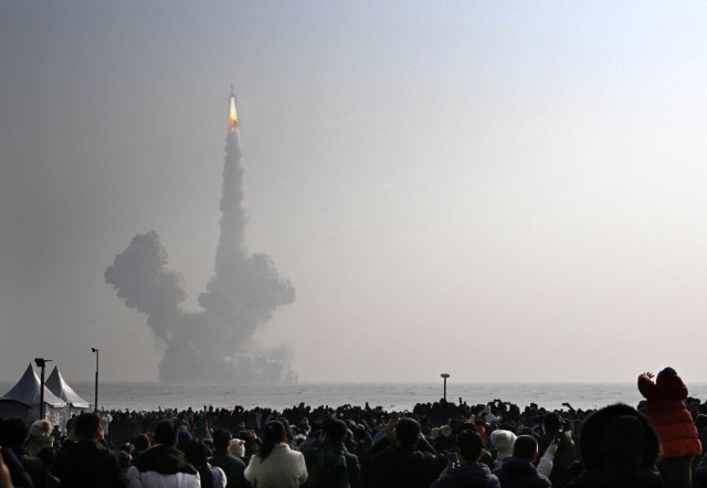 2024年1月11日,人们在山东省海阳市连理岛上观看海上火箭发射。