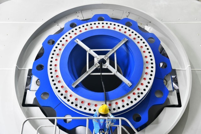 2023年6月21日,在乳山市远景能源零碳产业园,工作人员在海上风机前作业。