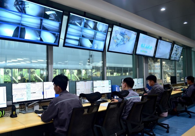 2023年10月25日,在亚太森博(山东)浆纸有限公司监控室,工作人员监看生产车间运行情况。