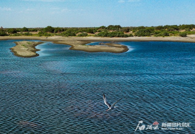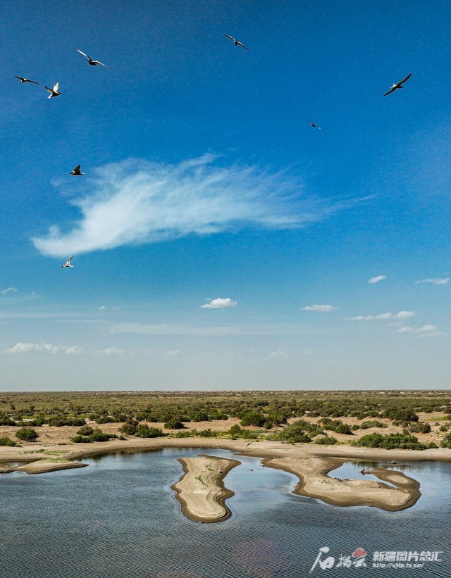 6月4日,位于阿克苏市柳源镇辖区的塔克拉玛干沙漠深处,水鸟在湖泊上空飞翔(无人机拍摄)。