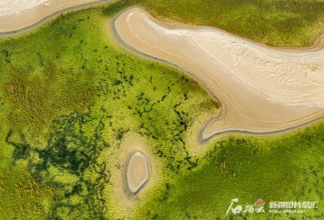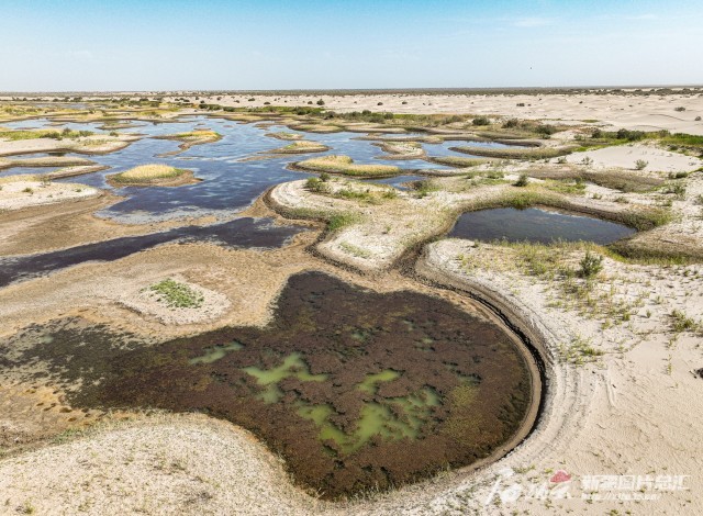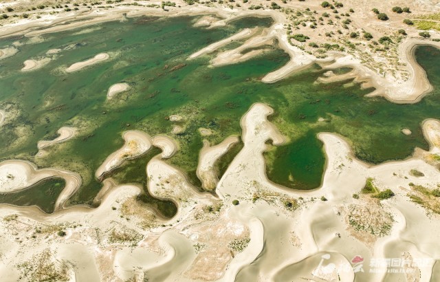 位于阿克苏市柳源镇辖区的塔克拉玛干沙漠深处,白沙碧湖相映成趣,湖水中已经生长出藻类植物(6月4日无人机摄)。