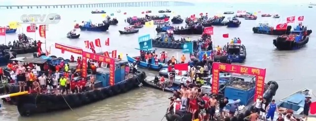 在福建省石狮市,赛龙舟传统却是在海里进行的。石狮市蚶江镇的蚶江龙舟代表队正在海里训练,全力备战即将到来的第十八届闽台对渡文化节暨蚶江海上泼水节龙舟邀请赛。这项赛事每年都能吸引数十万的游客前来参与。除了龙舟竞渡,精彩纷呈的海上活动更是吸引人眼球。