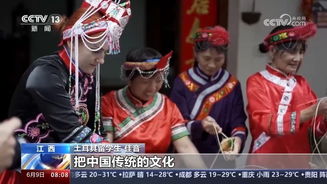在黑龙江绥芬河市,俄罗斯游客穿上了中华传统民族服饰,与当地居民一起包粽子、画彩蛋,玩得不亦乐乎。