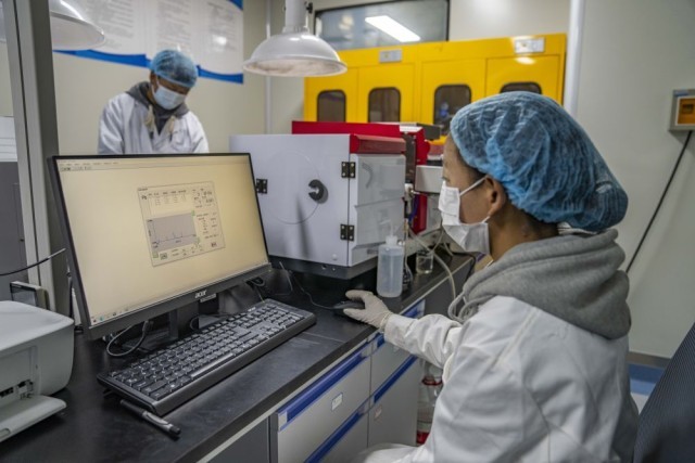 在聂荣县嘎确生态畜牧业发展有限责任公司,检验员达娃卓玛在检测奶制品(5月13日摄)。新华社记者 孙非 摄
