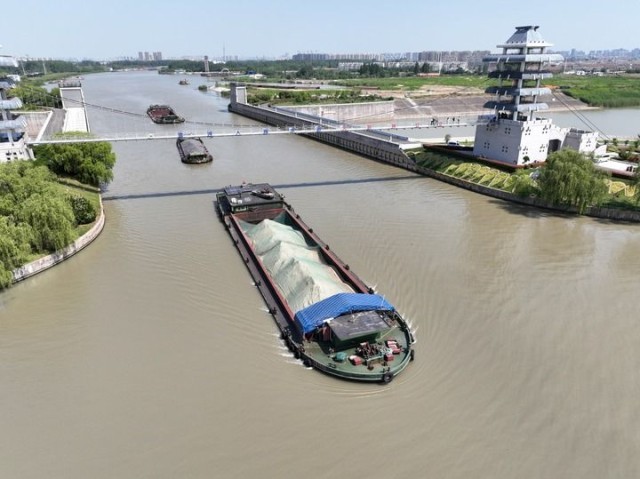 5月28日,运输煤炭、建材等物资的船只在京杭大运河航行。