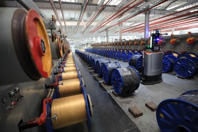 5月29日,在中天钢铁集团(淮安)新材料有限公司智能化生产车间,AGV小车在搬运物资。