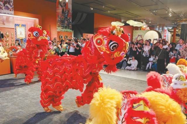 “快来,舞狮表演开始了!”随着锣鼓擂响,“气象万千——中国非遗保护实践主题展”的民俗展演区域聚满了观众,两头精气神十足的广东醒狮登场。广东醒狮的基本动作包括睁眼、洗须、舔身、抖毛等,主要套路有采青、高台饮水、狮子吐球、踩梅花桩等。演出的尾声,两头醒狮吐出一副对联——“赓续历史文脉”“保护传承非遗”,引得观众连连叫好。