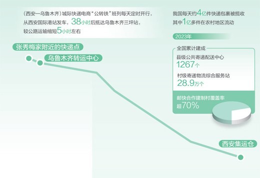 包裹经(西安—乌鲁木齐)城际快递电商“公转铁”班列至张秀梅家附近快递点的路线示意图。