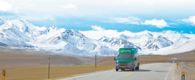 邮政快递车行驶在通往新疆喀什地区的路上。