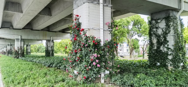上海郊区奉贤区,也有立体绿化,绵延4公里之长。大叶公路(肖杰路-金海公路)道路立体绿化全长4公里,工程内容主要包括高架桥柱绿化、沿口绿化以及附属滴灌设施。高架桥柱绿化共计实施233根,桥柱绿化施工高度为4.5-6米,面积约7300平方米,充分应用了月季“安吉拉”和“弗洛伦蒂娜”、红木香、意大利络石等开花植物。