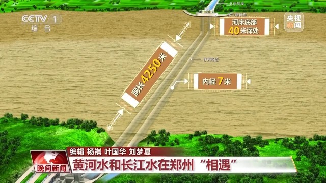 南水北调工程建设者在郑州花园口西黄河河床底部40米深处开凿两条隧道,穿黄隧道为双线有压输水隧道,单个洞长4250米,内径7米,这样的内径可以满足洞内跑汽车。有了“穿黄工程”,北上的长江水通过两条穿黄隧道与黄河立体交叉相遇。平时,黄河水在上面流,南水北调的长江水在河底隧道中流过,两者上下而过,犹如一条巨龙在黄河之下隐去了身影。