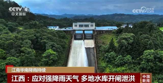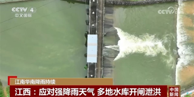 受上游持续强降雨天气影响,抚州市广昌县中坊水库水位已经超过159米的汛限水位。14日上午,水库开闸腾空库容,减轻上下游防洪压力。在江西新余,仙女湖江口水库水位接近汛限水位68.5米,为保证水库安全,江口水库于12日开闸泄洪,湍急的水流从闸门倾泻而下,形成巨大的浪水幕。