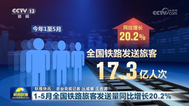 记者从国铁集团了解到,今年1—5月,全国铁路发送旅客17.3亿人次,同比增长20.2%,运输安全平稳有序。1—5月全国铁路日均开行旅客列车10463列,同比增加1174列,增长12.7%;5月1日发送旅客2069.3万人次,创单日旅客发送量历史新高。