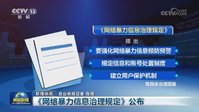 近日,国家互联网信息办公室联合公安部、文化和旅游部、国家广播电视总局公布《网络暴力信息治理规定》,提出要强化网络暴力信息预防预警、规定信息和账号处置制度、建立用户保护机制等具体治理措施。《规定》自2024年8月1日起施行。