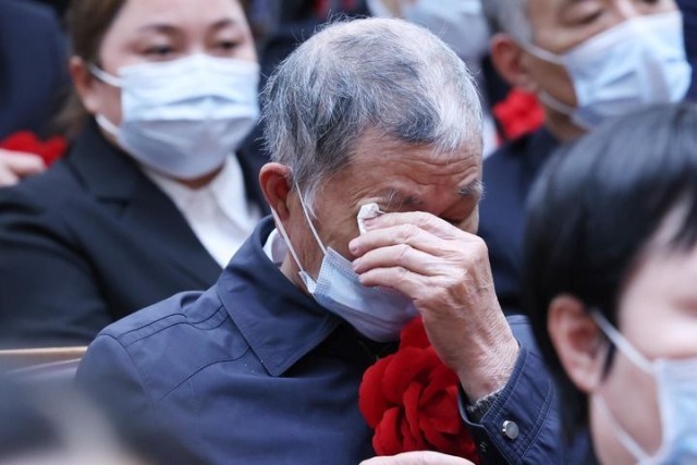 2021年2月25日,全国脱贫攻坚总结表彰大会在北京人民大会堂隆重举行。会上,“全国脱贫攻坚楷模”黄文秀的父亲黄忠杰替女儿戴上了大红花,洒下泪水。新华社记者 刘彬 摄