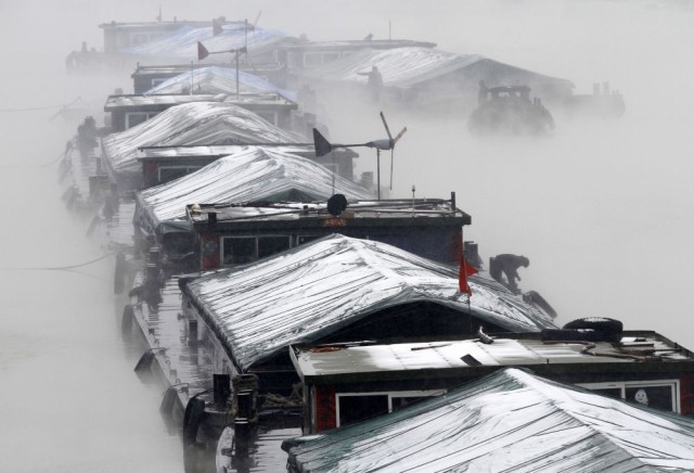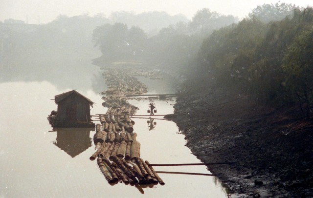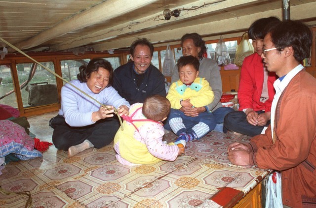 1997年, 浙江余杭老船民钱盛祥(左二)一家四代住在船上,古老的大运河成为他们一家生活的唯一指靠。