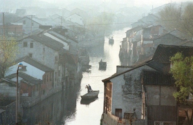 1992年,浙江德清的渔民们在古运河上划着小船去珍珠养殖场育珠。