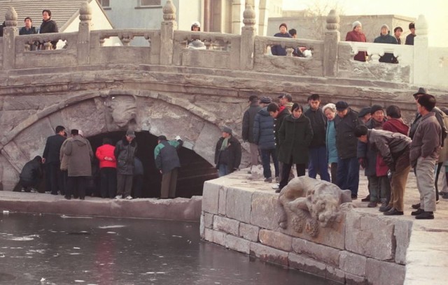 2000年12月21日,大批老北京市民前来观看重现历史风貌的后门桥。后门桥是京杭大运河的一处重要遗迹,又称万宁桥、地安桥。