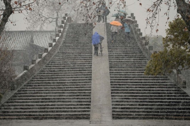 2014年2月18日,行人冒雪从京杭大运河杭州段拱宸桥上走过。